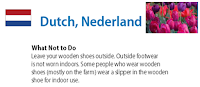 If encountering a neighbour who the guide refers to as "Dutch/ Nederland" the "what not do do" advice includes leaving your wooden shoes outside, noting that "Some who wear wooden shoes (mostly on the farm) wear a slipper in the shoe for indoor use." Fancy that in this day and age.